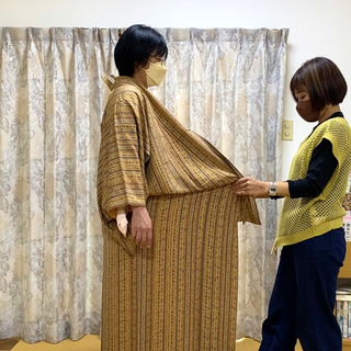 その全カリキュラムの半分くらい経過したところで、トルソーではなく、人間さまに実際にお着付けしていただく回を設けています。